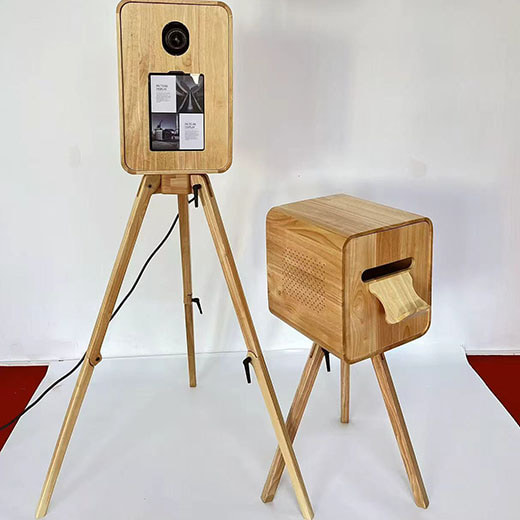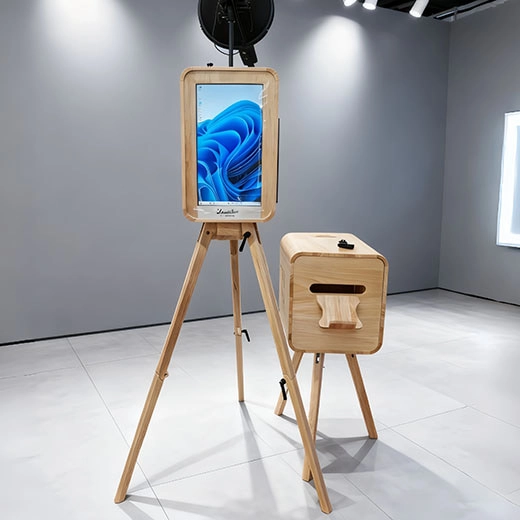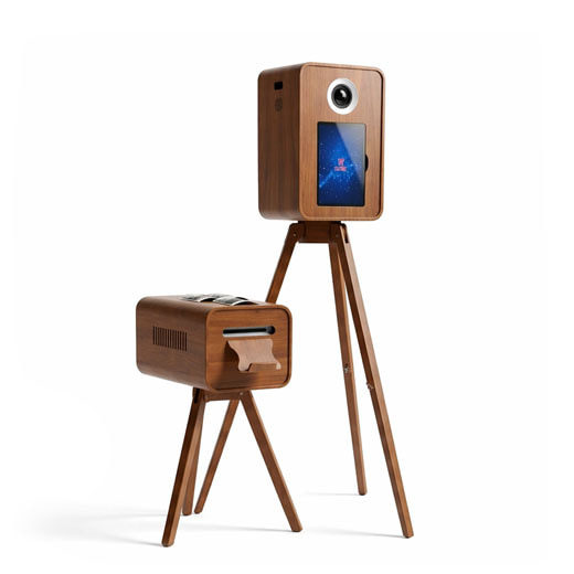 Корпус выполнен из натуральных материалов и имеет премиальный внешний вид, благодаря чему фотобудка воспринимается как элемент декора. Устройство оснащено двумя экранами: внешний экран можно забрендировать под мероприятие, а внутренний используется для удобного управления процессом съёмки.